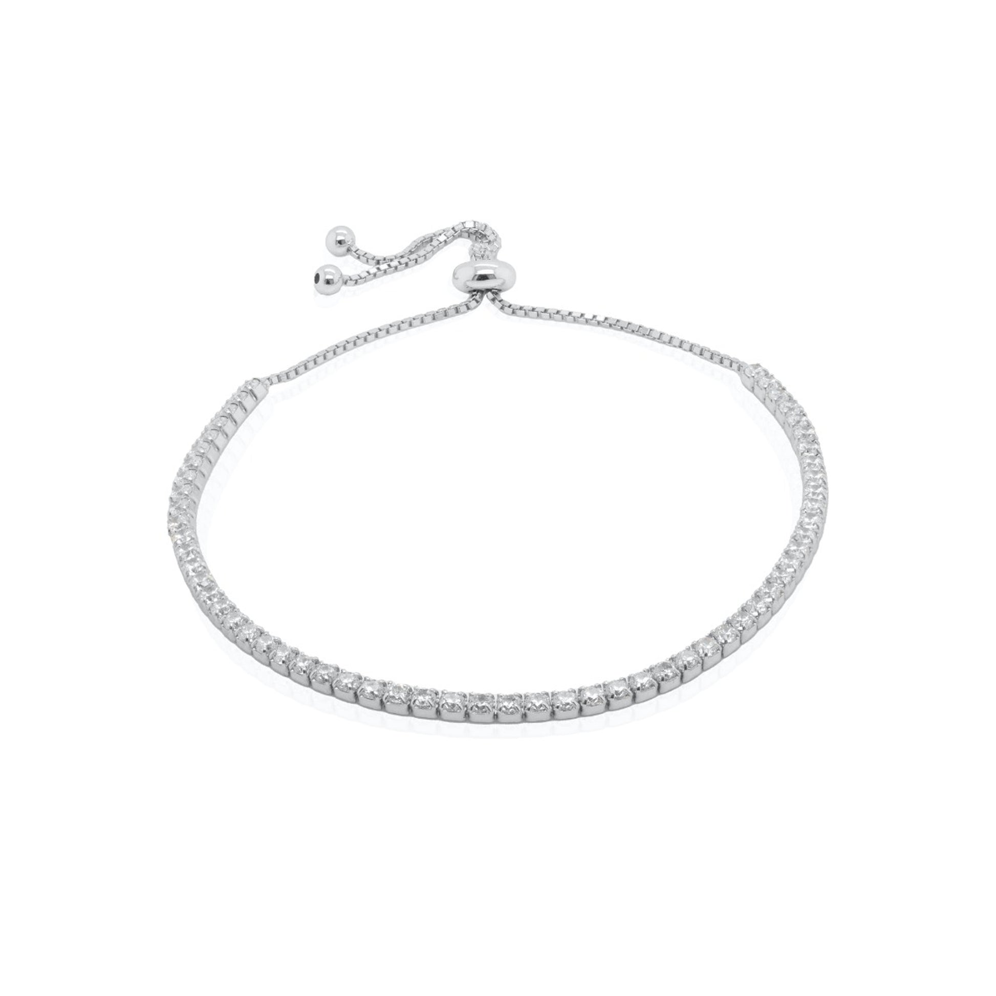 Sterling Silver, Rhodium Plated. 2.5mm Cubic Zirconia adjustable bracelet.